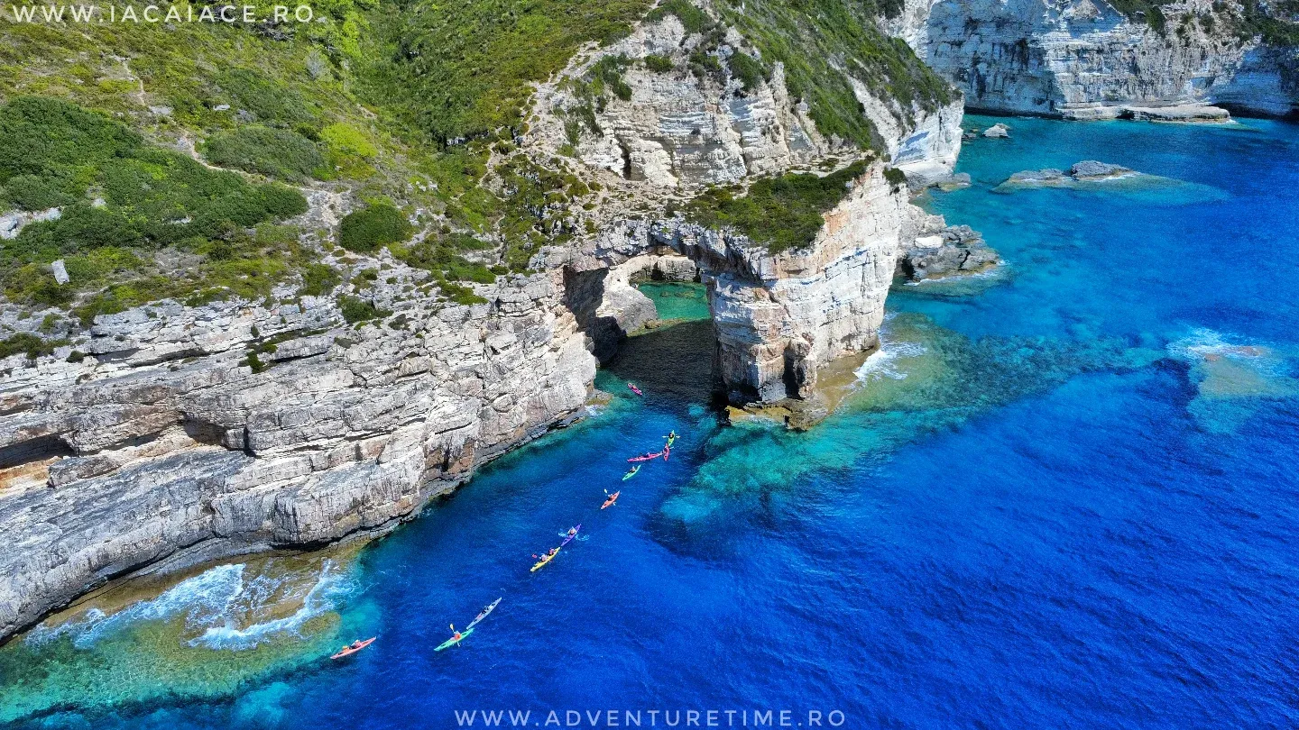 📅 ZIUA 5 (Marți): Peșterile și Catedralele de stâncă Revenim în caiace pentru a explora partea nordică a insulei Paxos (~14km). Aici natura a sculptat forme gotice în stâncă. Vom trece cu caiacele prin peșteri și tuneluri naturale, culminând cu o ARCADĂ impresionantă săpată de apă.